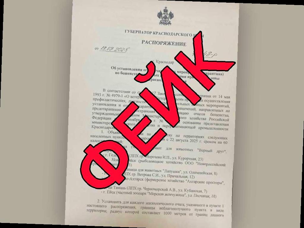 Однако представители оперштаба подтверждают, что это документ является подделкой. В данный момент ситуация с бешенством на территории региона стабильна и находится под контролем департамента ветеринарии Краснодарского края.
