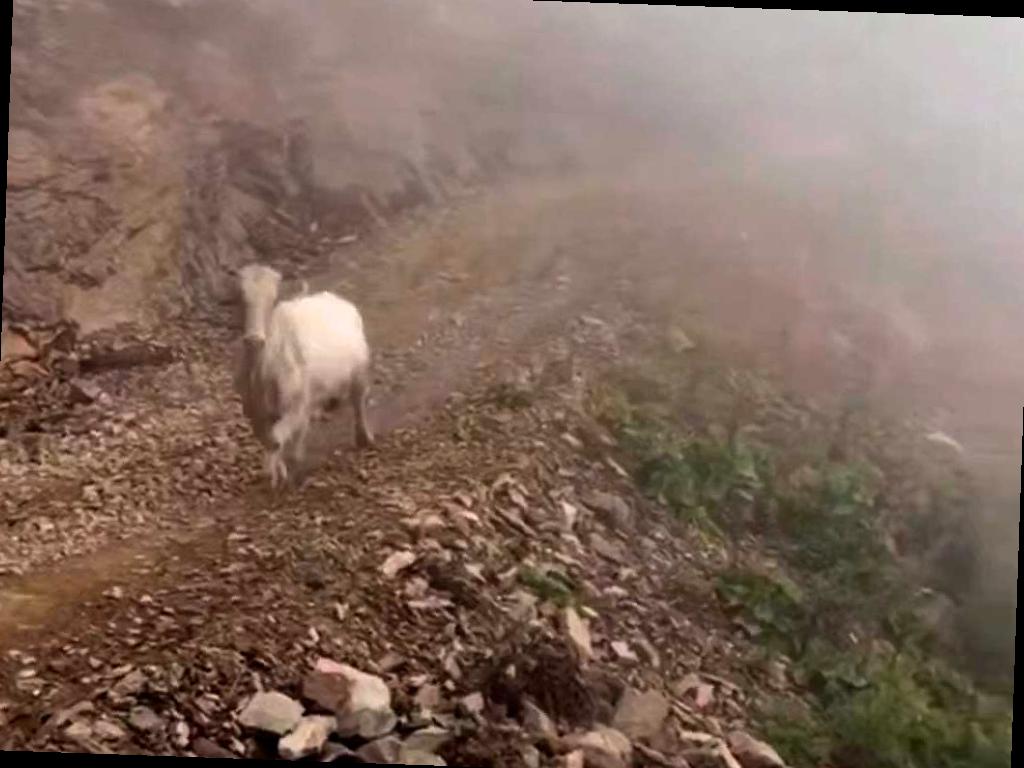 Группа туристов столкнулась с коровой на узкой каменистой тропе. Животное проявило интерес к людям, не отрываясь от оператора.