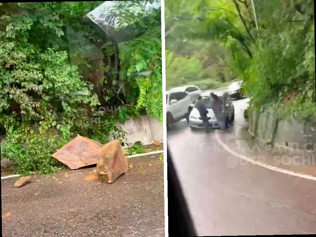 Большие камни сорвались с обрыва и упали прямо на дорогу. Один из камней задел едущий в сторону Дагомыса автомобиль. Водитель избежал серьезных последствий, никто не пострадал, но машина получила повреждения, сообщает телеграм-канал «ДТП Сочи».