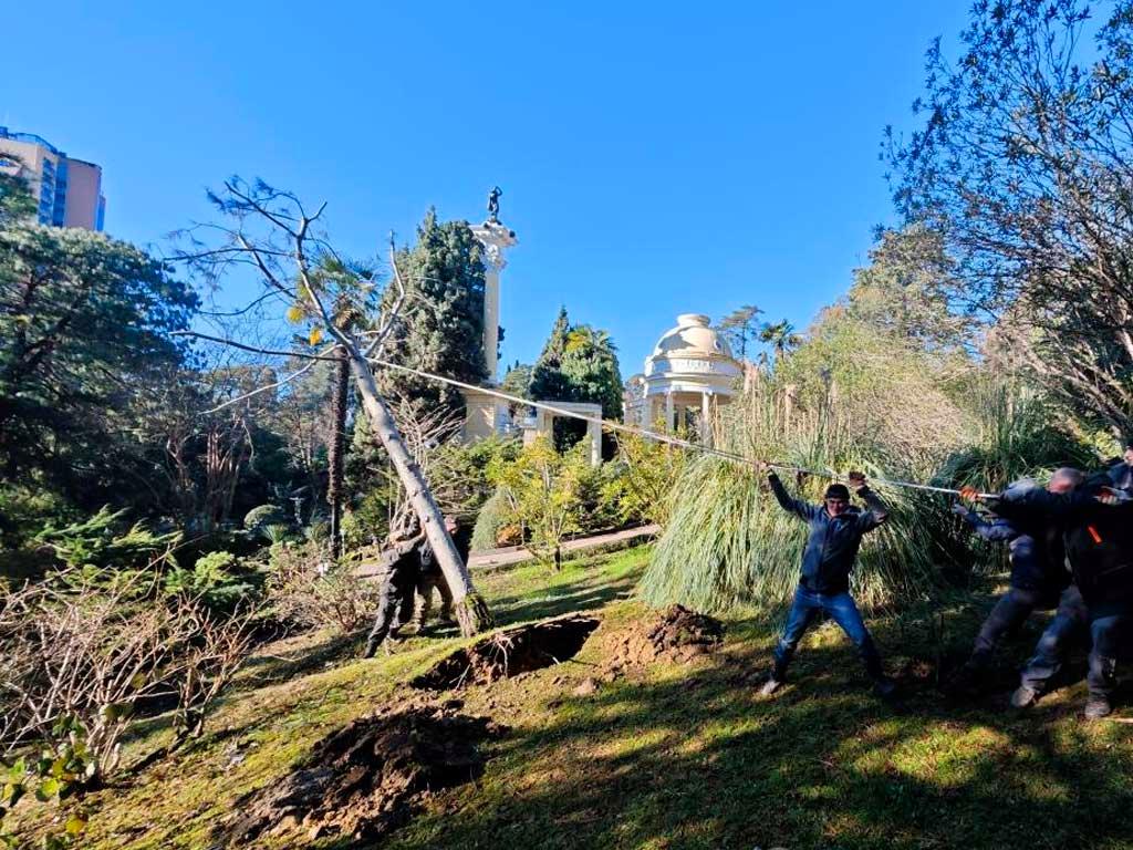 Дерево было повалено ветром, но корневая система осталась недостаточно поврежденной, чтобы отказываться от спасения. Сотрудники парка провели работы по восстановлению кроны, подняли ствол и закрепили его. Теперь состояние сосны стабилизировано, и у нее есть шанс на восстановление.